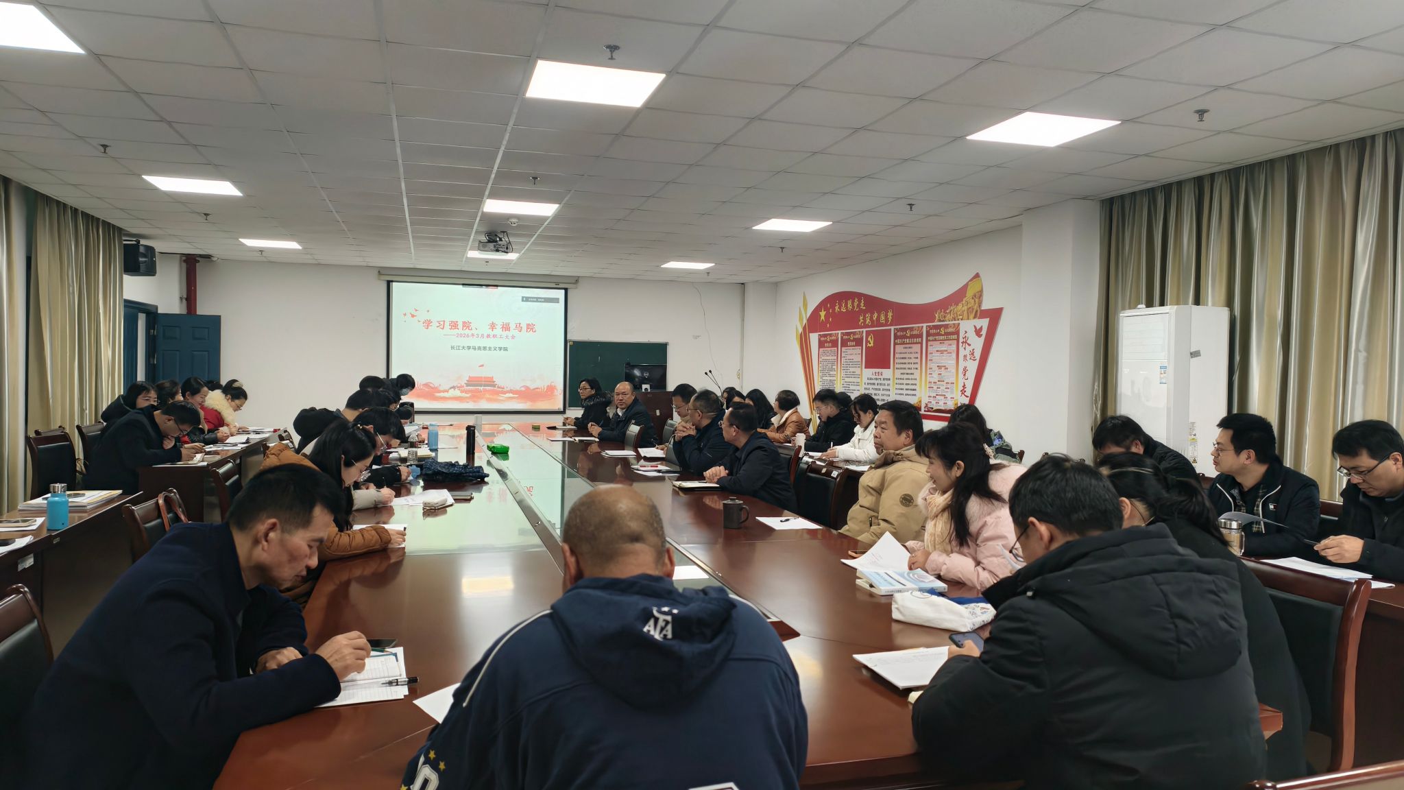 3月1日上午,英国上市365官网在文科楼1104室召开全体教职工大会,全面部署新学期重点工作,凝聚发展共识。会议由院长姜学勤主持,全院教职工参会。
