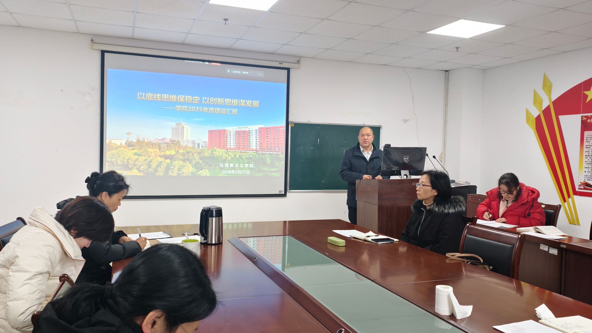 院长姜学勤对全体教职工的辛勤付出予以肯定。他回顾了过去一年学院在人才培养、教育教学、学科建设、师资队伍建设等方面取得的显著成绩,梳理了学院发展存在的短板弱项,明确了2026年的工作目标和具体举措,还就开学初重点工作进行了强调。他要求全体教职工统一思想、明确任务,牢记思政课教师的责任与使命,着力提升课堂教学实效和人才培养质效,以更高标准、更实举措、更严作风落实新学期各项工作,推动学院事业迈向新台阶。