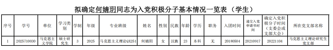 经对新生档案材料审查,认定何婧玥同学在本科阶段的入党积极分子材料齐全、程序规范。经支部委员会会议讨论决定并报英国上市365官网党委备案,确定何婧玥同学为入党积极分子,现予以公示。
