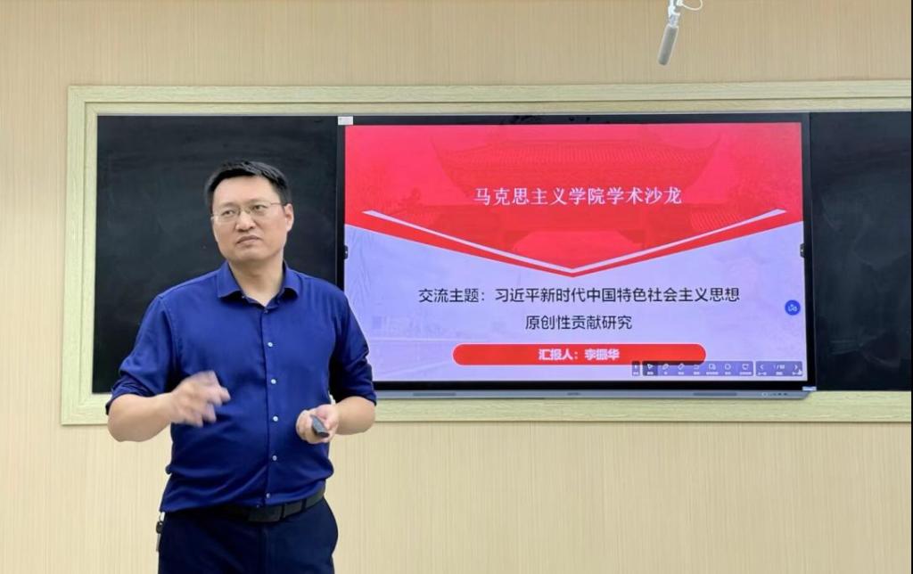 李振华副教授首先大致介绍了习近平新时代中国特色社会主义思想研究的整体情况及学术热点问题,然后详细梳理了当前学术界关于习近平新时代中国特色社会主义思想原创性贡献认识的六类观点以及对“原创性贡献”标准的界定,并深入分析了每一类观点的优点及不足,在扎实的文献综述基础上,他提出了判断习近平新时代中国特色社会主义思想原创性贡献的三个原则,一是实践性原则,即是否解决了现实问题;二是思想性原则,即是否拓展了前人思想谱系;三是时代性原则,即是否能观察时代、把握时代、引领时代。最后,李振华副教授总结了研究原创性贡献的方法。除了原创性贡献问题,李振华副教授还介绍了习近平新时代中国特色社会主义思想整体性研究的相关情况。